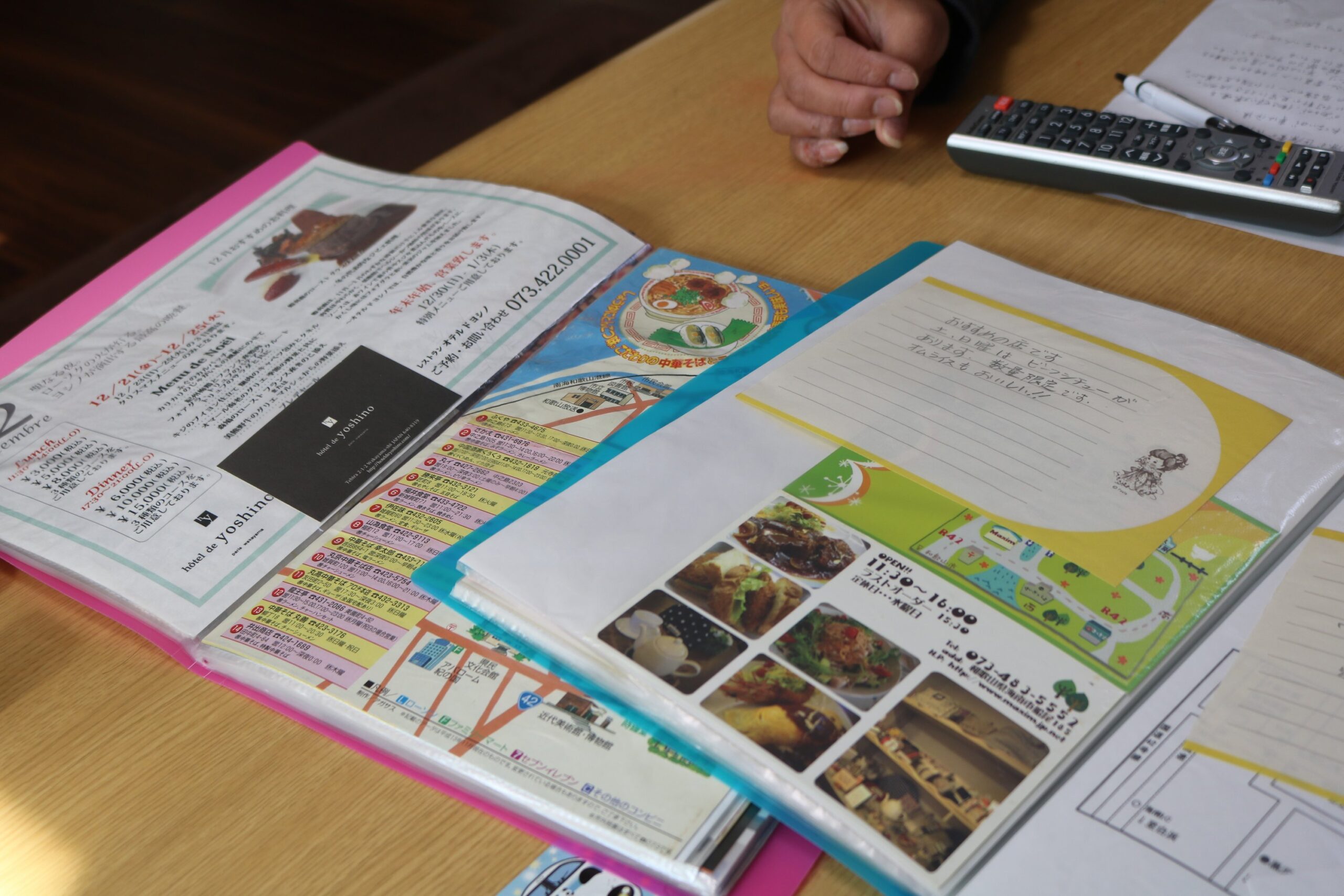 入居後、思いがけない知らせがあった。この物件の前の所有者さんより、郵送でファイルが届いた。中身は、前の所有者さんが居住していた頃に訪れた、飲食店のパンフレットや名刺だった。一つずつ丁寧にファイリングされ、『おいしいです!おすすめです』『県外からも来られています』など、手書きのメモも添えられていた。中には、『道がせまい!』と、大きな車を使用する井手さん一家を気遣うコメントもあった。井手さんは、その気持ちに感謝しながら、これらを参考に飲食店巡りも楽しんでいるそうだ。いまもなお、前の所有者さんとの交流は続いている。